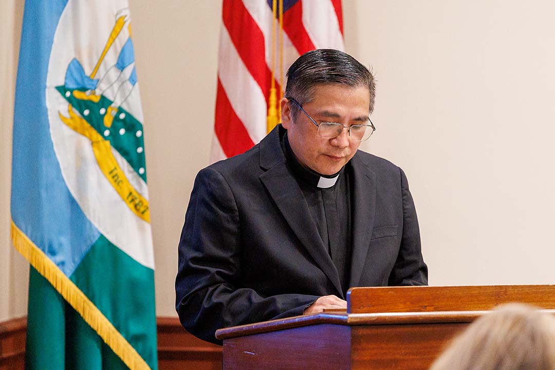 After a prayer offered by Fr. Augustine of St. Francis of Assisi, First Selectwoman Samantha Nestor administered the oath of office. Ms. Nestor noted pride in having sworn in Sgt. Vichiola when he became a Weston officer in 2021 after two years of service in Southbury.