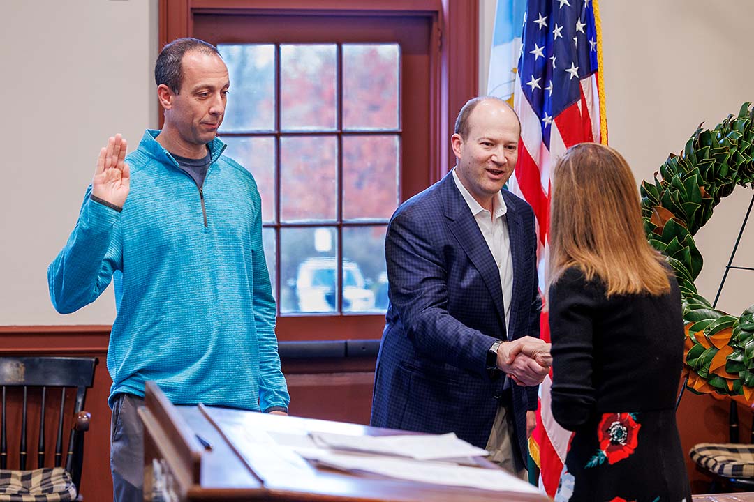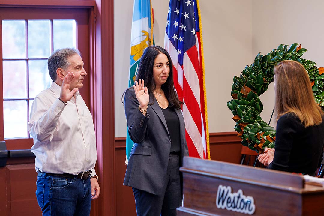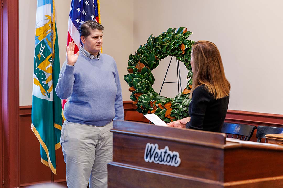 Most newly elected and reelected Weston officials were sworn in at Town Hall on Wednesday, the oath of office administered by Lt. Governor Susan Bysiewicz.
