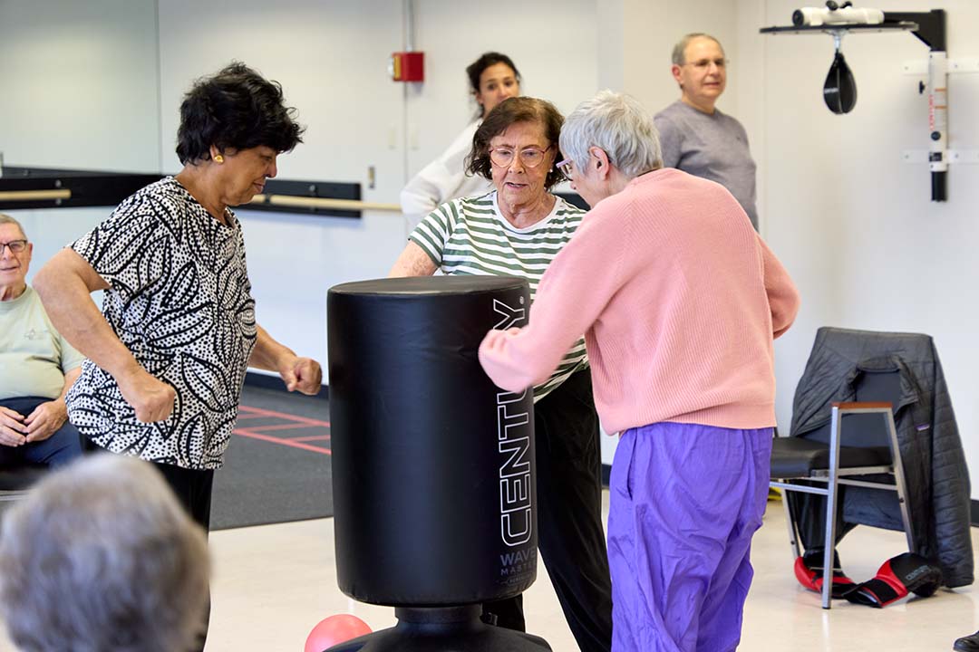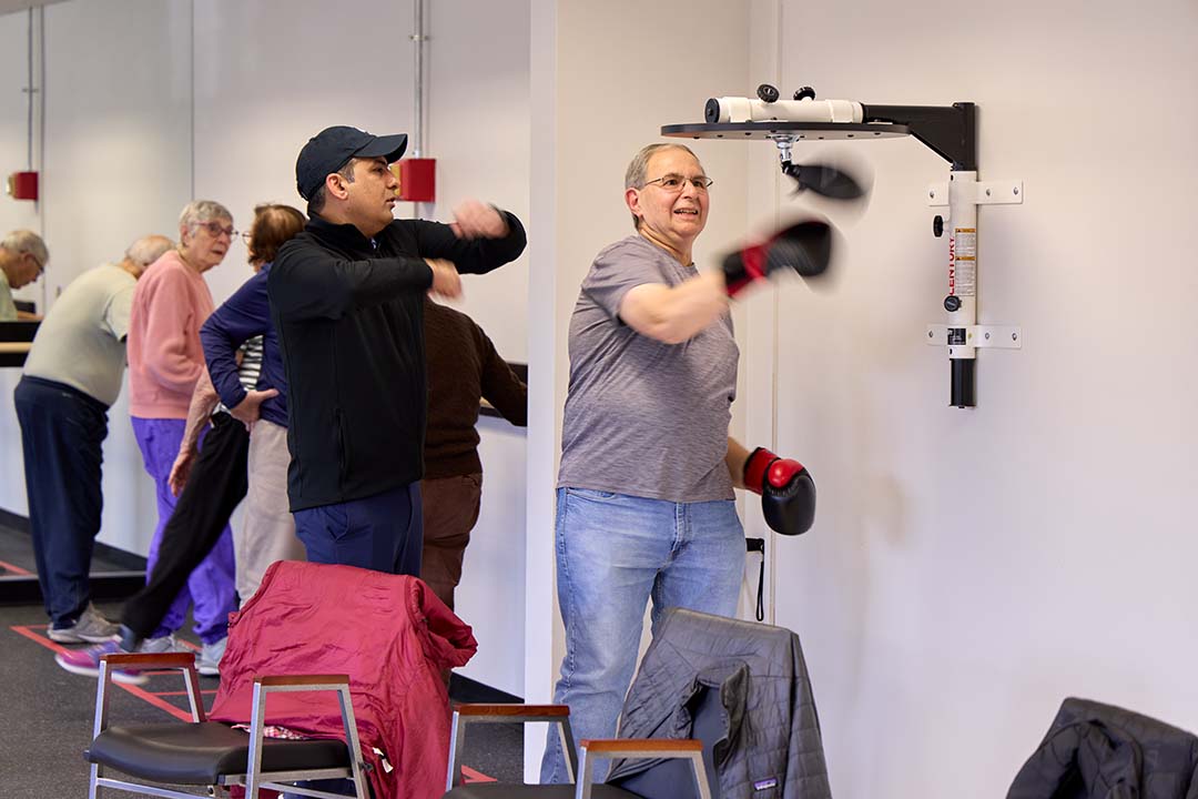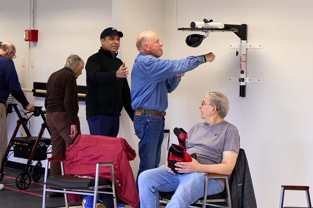 Boxing is one element of Dr. Gianchandani’s Thrive with Movement program at the senior center, along with light weight training, and movement, balance, and mobility drills.