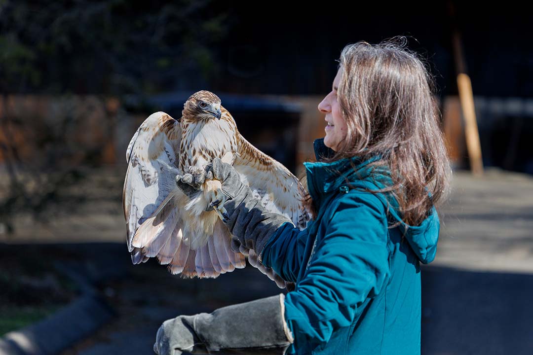 On Saturday, members of Weston Kiwanis looked on as a red-tailed hawk was released back into the wild by Dara Reid, director of the Wildlife in Crisis center in Weston.