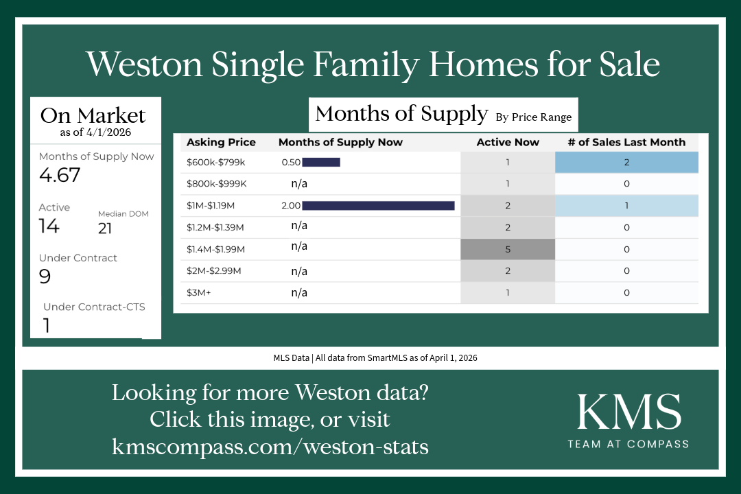 Four Weston properties sold in March. Eight sold in the same month last year. Total sales: $3,465,000. Median sale price: $815,000.