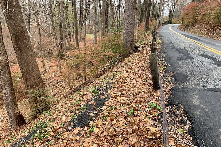 Going north on Valley Forge from Davis Hill Road, toward the reservoir, the damaged roadside is on your left, about 100 feet from Davis Hill. The shoulder is only about two feet wide, the top of a slope that drops down sharply about 30 feet. There is no built-in drainage, so rainwater flows down the slope, speeding the erosion.
