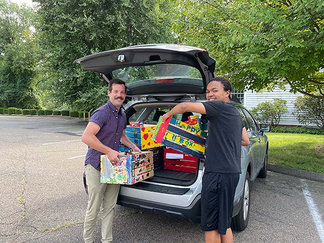 Pastor Thomas Burke and youth counselor Casey Lerner loaded eight hand-decorated crates filled with food donated by VBS campers to the Weston Food Pantry.