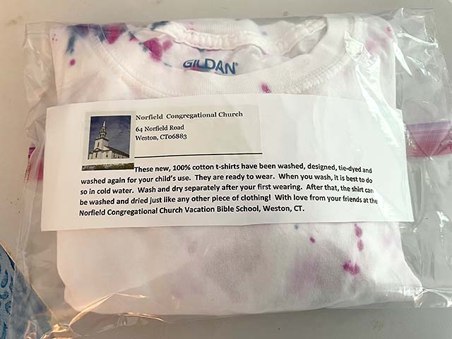 Norfield laundered 100% Cotton t-shirts so campers could tie-dye each one and include a note of good wishes for the coming school year to all child recipients. Shirts were donated to Goodwill of Westport.
