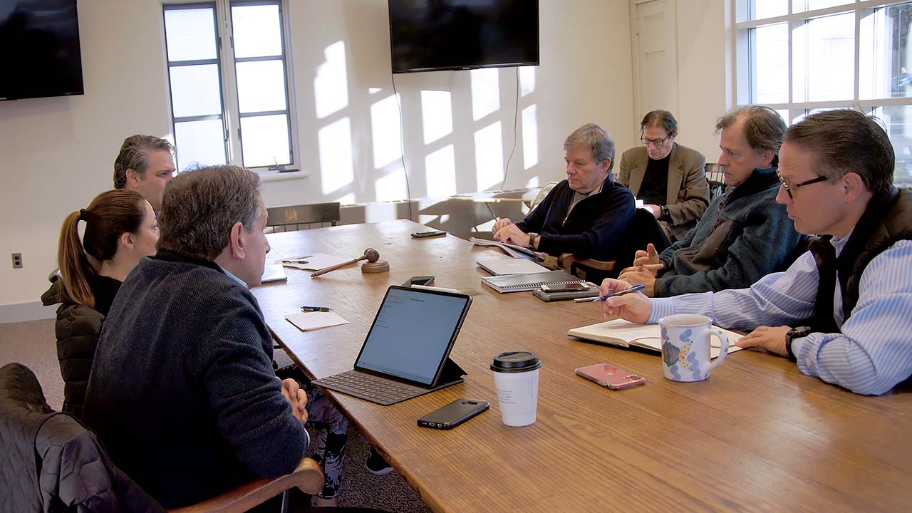 Clockwise from foreground left: Dr. Pesco, Ms. Weinstein, then-First Selectman Chris Spaulding, Mr. Ezzes, an observer, Mr. Baldwin, Mr. Bertasi. Other members joined by telephone. Photo: M.S. Wirtenberg.