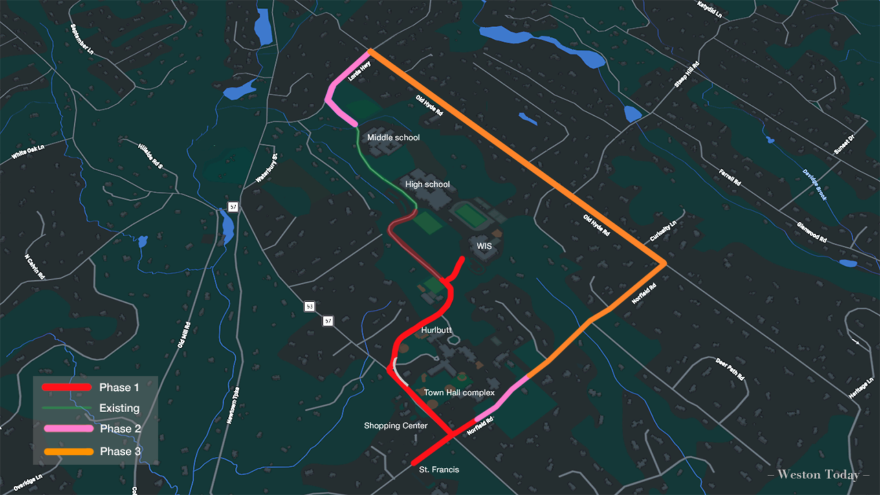 Sidewalks in the second phase extend from Weston Middle School to Lords Highway, then make a right turn and run up to Old Hyde Road. Another section connects the Town Hall campus to Norfield Church.
