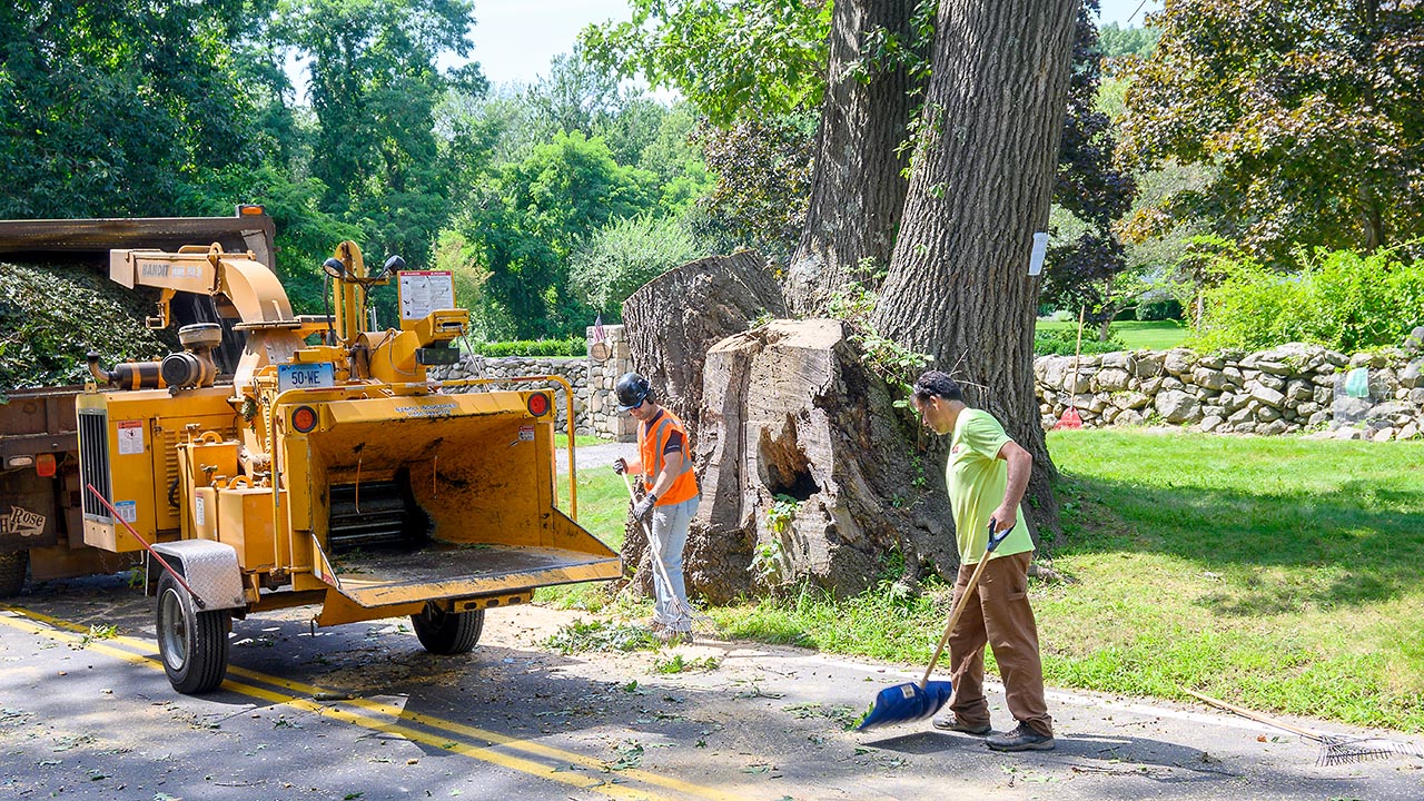 On Monday morning, crews began taking down the Norfield Oak, the large old red oak tree on the corner of Norfield Road and Norfield Farm Lane.