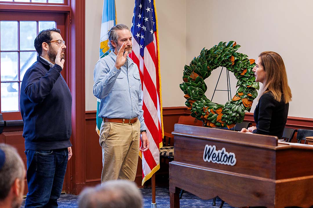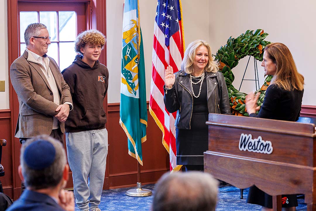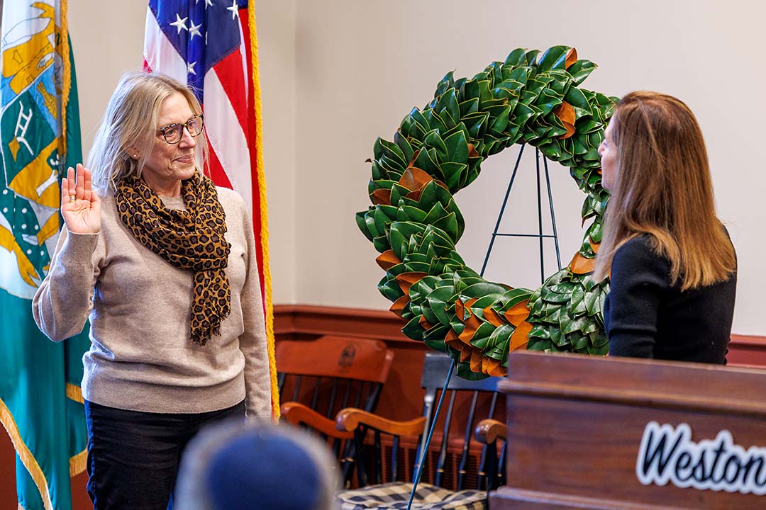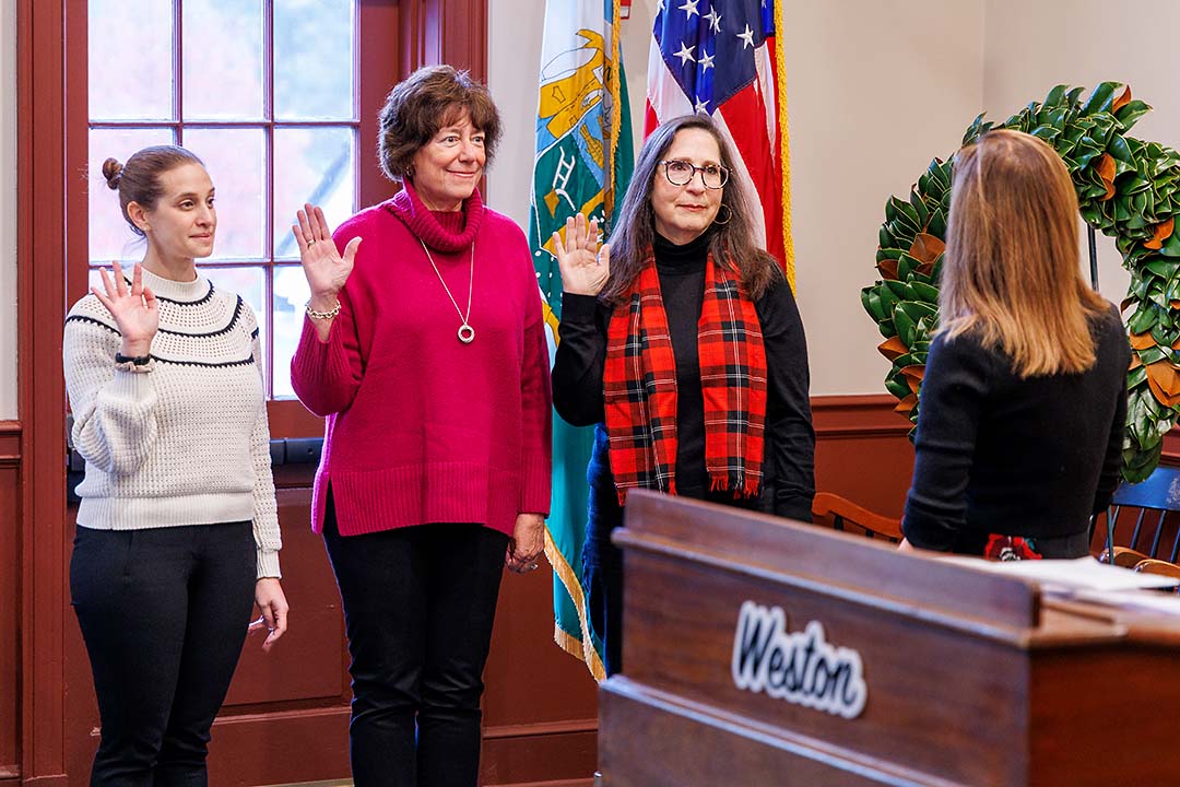 Most newly elected and reelected Weston officials were sworn in at Town Hall on Wednesday, the oath of office administered by Lt. Governor Susan Bysiewicz.