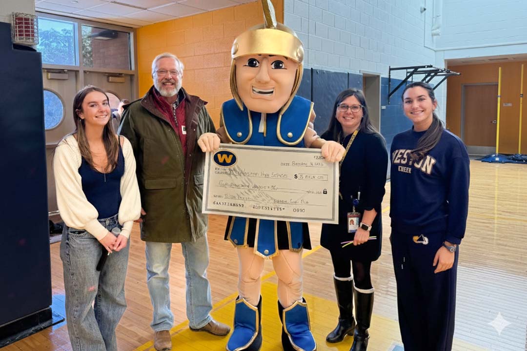 The high school also has a new mascot, thanks to a donation by the Weston Gun Club. In the photo above, accepting the donation are Alice Sullivan, student government co-president, Ken Friedrichsen, Weston Gun Club president, the new mascot, Principal Meghan Conetta, and student government co-president Izzy Gronowetter.