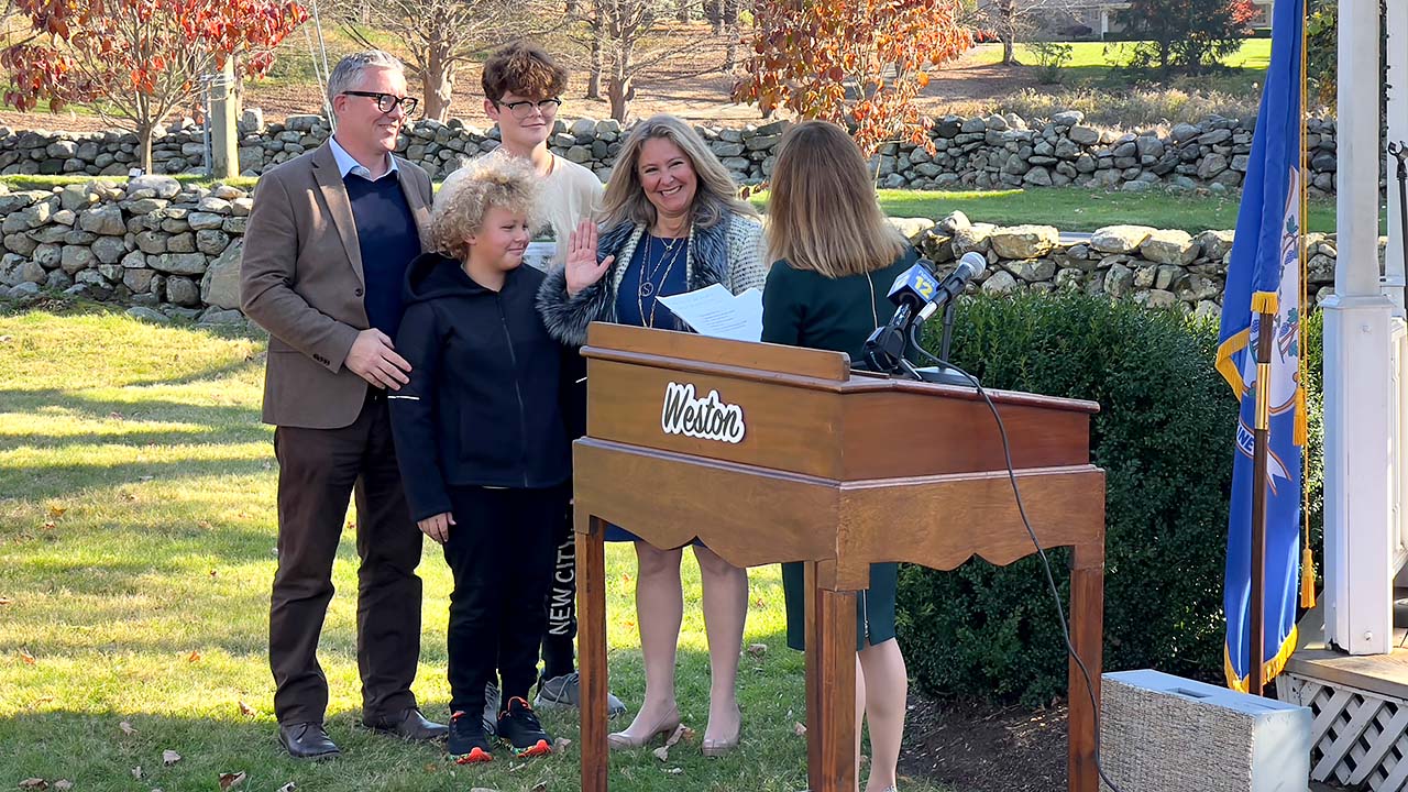 November 10, 2021 — Newly-elected and reelected members of Weston boards and commissions were sworn in by Lt. Governor Susan Bysiewicz at the Town Hall gazebo on November 9. Full story.